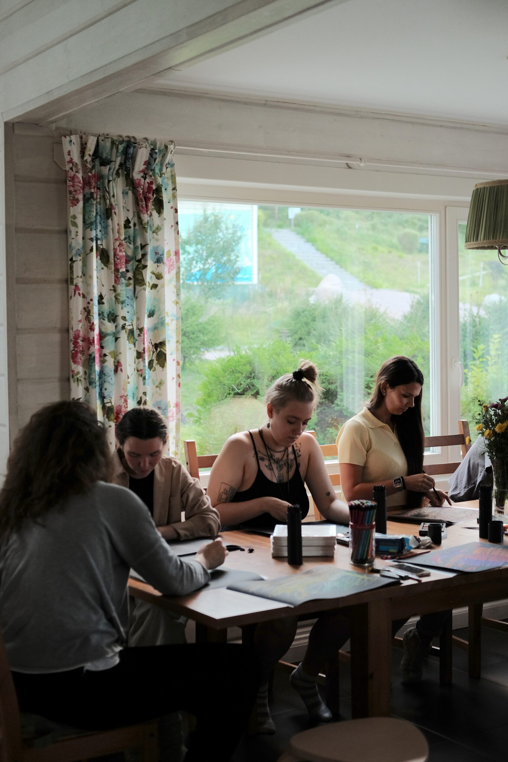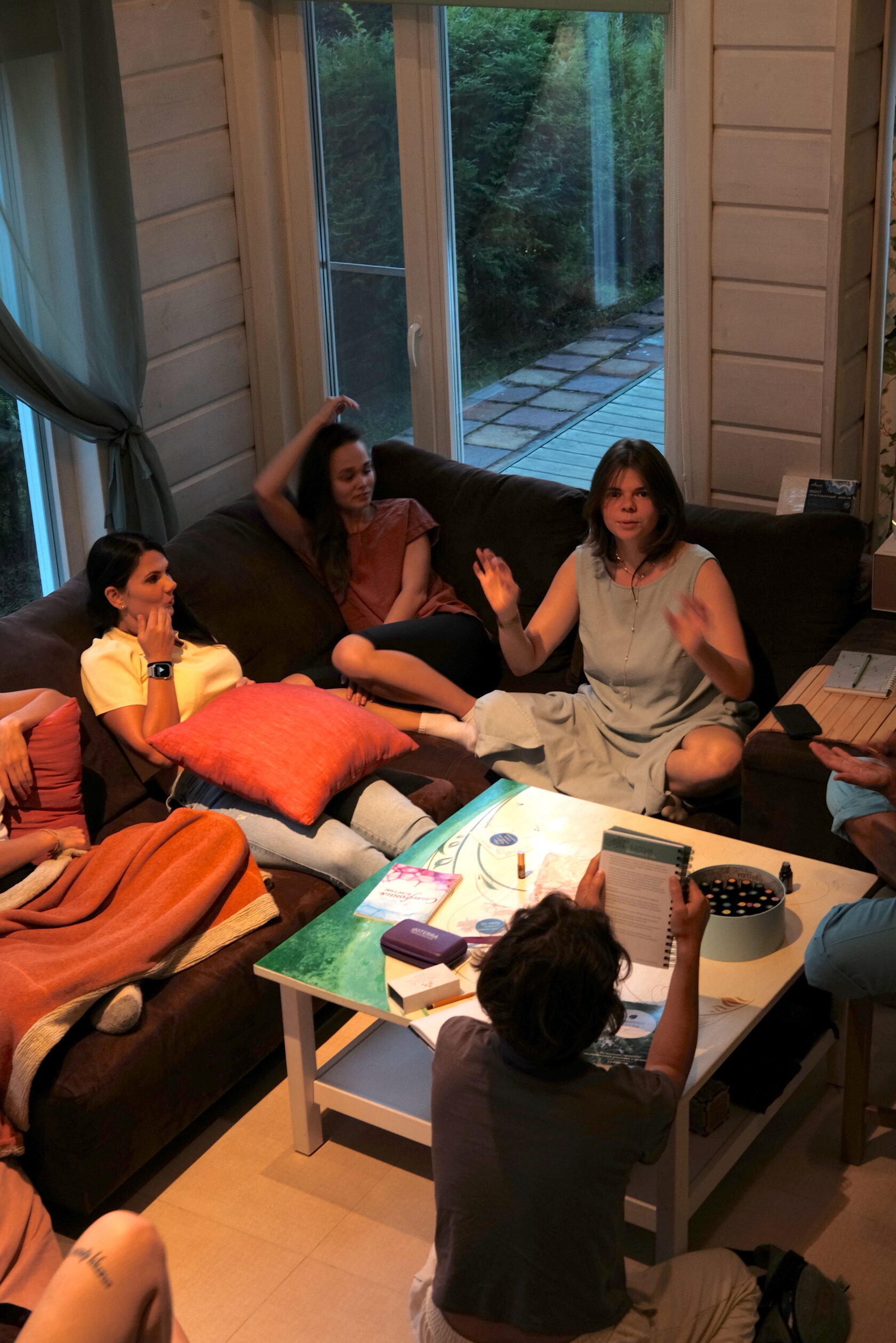 • Заселение 15:00 • Обед • Чайная церемония • Арт-терапия • Беседы у костра • По желанию баня • Ужин